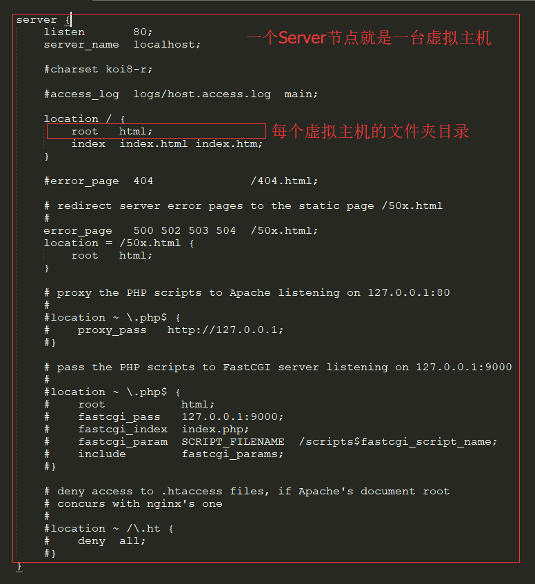 一个 server 节点就是一台虚拟主机,location / 子节点中的 root 就是指该虚拟主机的文件夹。