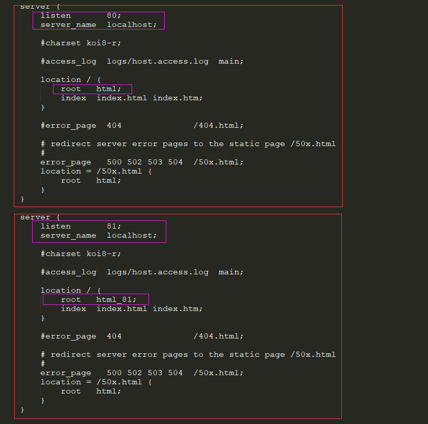 为了方便演示,删除注释部分的代码,拷贝一份,修改端口号为81,修改文件夹目录为html_81: