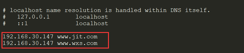 若我们当前服务器IP为 192.168.30.147,我们为 www.jiw.com 和 www.wxs.com 这两个网站进行手动添加 host,均指向 192.168.30.147。