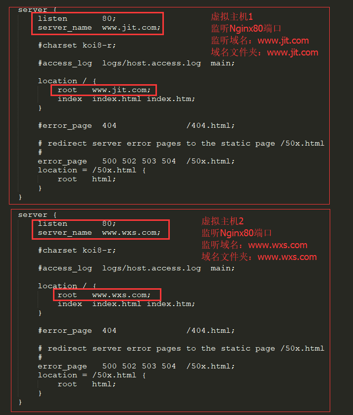 现在这两个网站都访问了 Nginx,Nginx 怎么才能区分他们呢?当然是通过域名!修改配置文件: