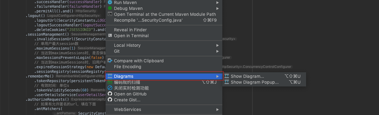 IDEA 的 Diagrams 功能使用起来非常简单,在你想要生成类图的类中右击选择 Diagrams 即可。