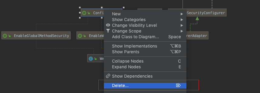 有时候我们需要移除类图中不相关的类,达到突出重点的目的。实现起来十分简单,选中想要删除的类,按下 DELETE 键即可。