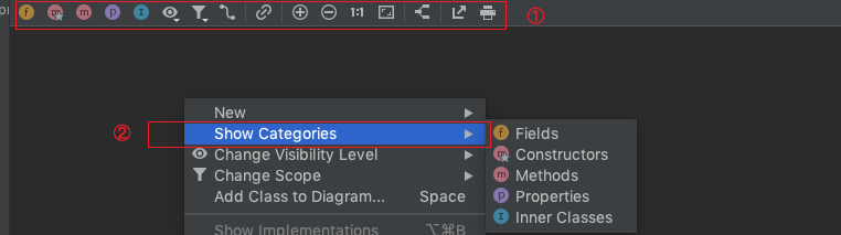 单纯的类图可能不能满足我们的需要,比如我们想要显示每个类的方法要怎么办呢。有两种方法,第一种是点类图标签页左上角的一排按钮,第二种是右击选择 Show Categories 即可。