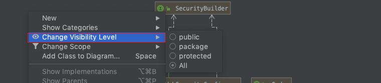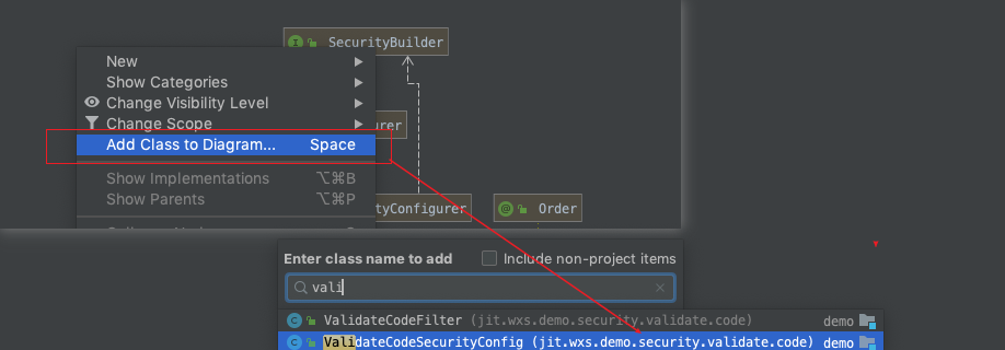 当我们还需要查看其他类和当前类图中的类是否有关系的时候,可以在当前类图中加入其他类。右键选择 Add Class to Diagram… ,然后在弹出框中输入类名即可。