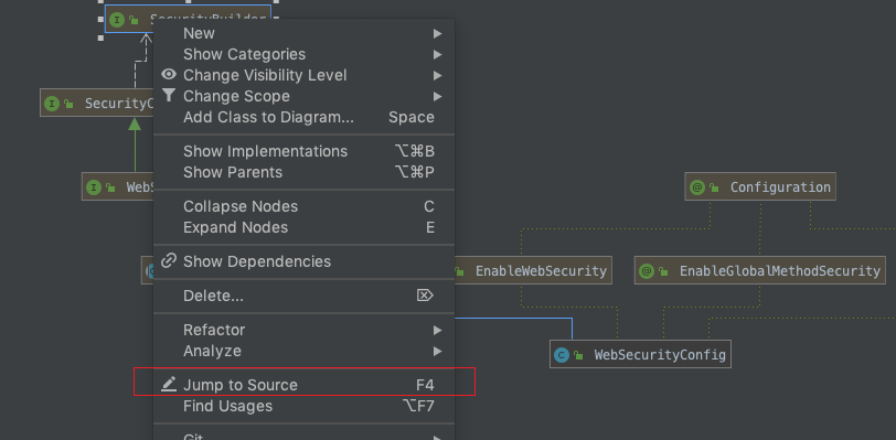 想要查看某个类的代码,在类图中选中某个类后,右击选择 Jump to Source 即可。