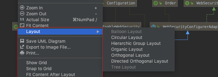 如果你不小心将类图弄乱了也没关系,IDEA 内置了多种布局,你可以任意选择。右键选择 Layout 即可,如下图所示。