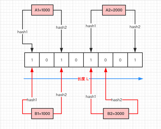 hash函数的运算(这里为 2 次);与 HashMap 有点类似,通过算出的 HashCode 与 L 取模后定位到 0、2 处,将该处的值设为 1。 - A2=2000 也是同理计算后将 4、7 位置设为 1。