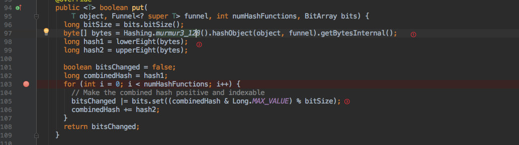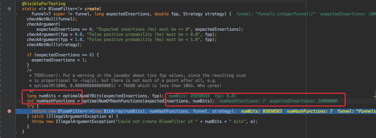 那就来看看 Guava 它是如何实现的。构造方法中有两个比较重要的参数,一个是预计存放多少数据,一个是可以接受的误报率。我这里的测试 demo 分别是 1000W 以及 0.01。
