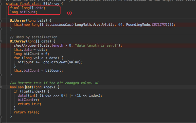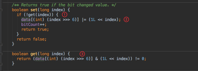 其实 set 方法是 BitArray 中的一个函数,BitArray 就是真正存放数据的底层数据结构。利用了一个 long[] data 来存放数据。所以 set() 时候也是对这个 data 做处理。