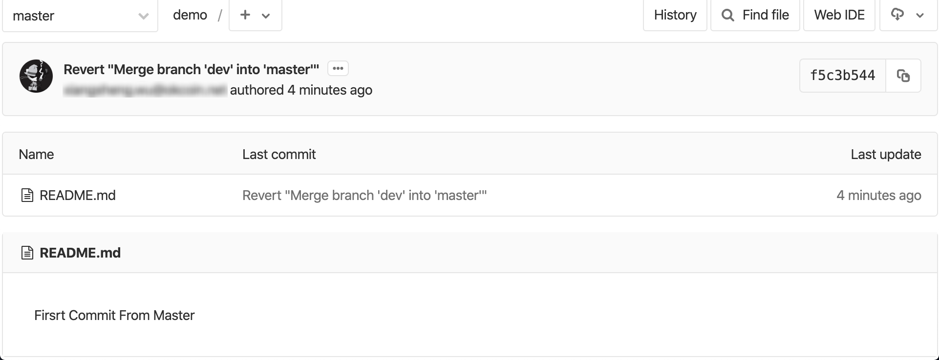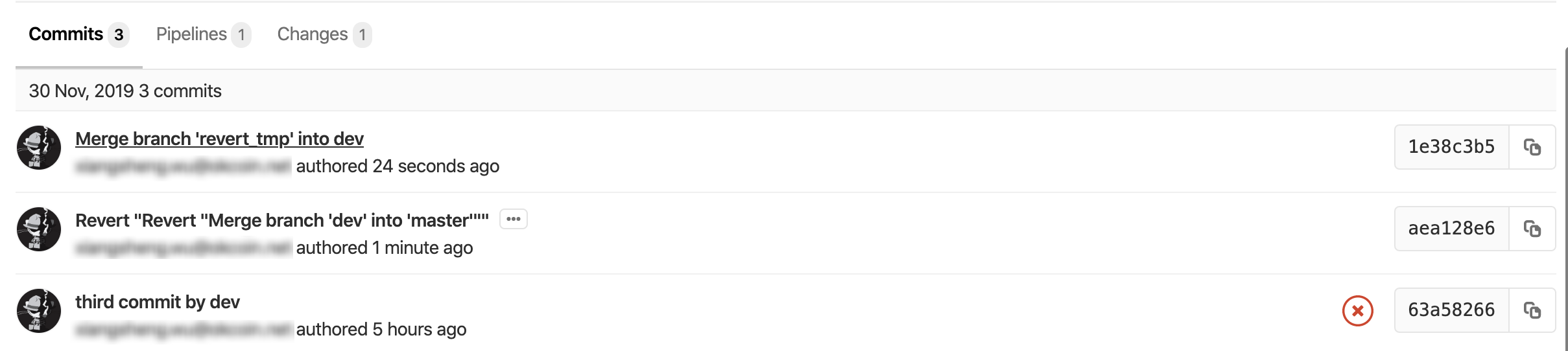 将 dev 分支推送到远程后,重新提交对 master 的 merge 申请。我们发现,在 revert 之前的提交记录还没有找回来,即 second commit by dev 这条记录没有找回来,如下图所示。