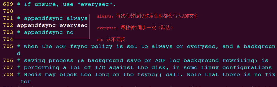 AOF 具有三种同步策略,在配置文件 redis.conf 中进行配置: