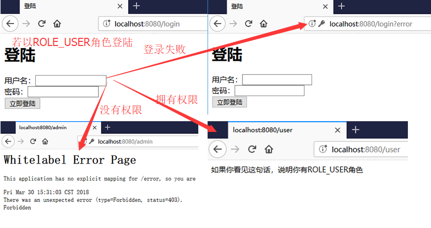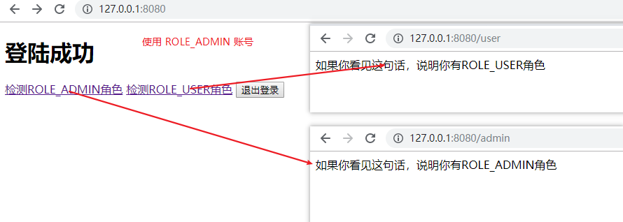 在该章中,我们存在两个角色,ROLE_ADMIN 和 ROLE_USER,并且经过我们的实验,/admin 接口只有 ROLE_ADMIN 有权限,/user 接口只有 ROLE_USER 有权限。