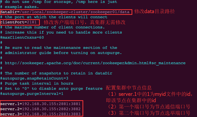 编辑 zoo.cfg,分别修改 dataDir 路径、clientPort(真集群忽略)、集群节点信息,如图所示: