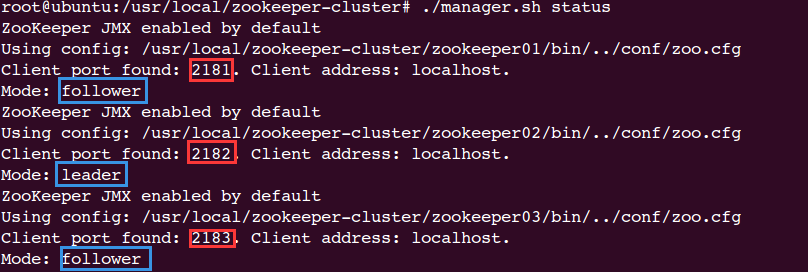 1 | root@ubuntu:/usr/local/zookeeper-cluster# ./manager.sh start |