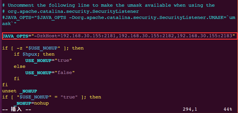 再次修改每个 tomcat 的 bin/catalina.sh 文件,修改 JAVA_OPTS 为 zookeeper 集群地址: