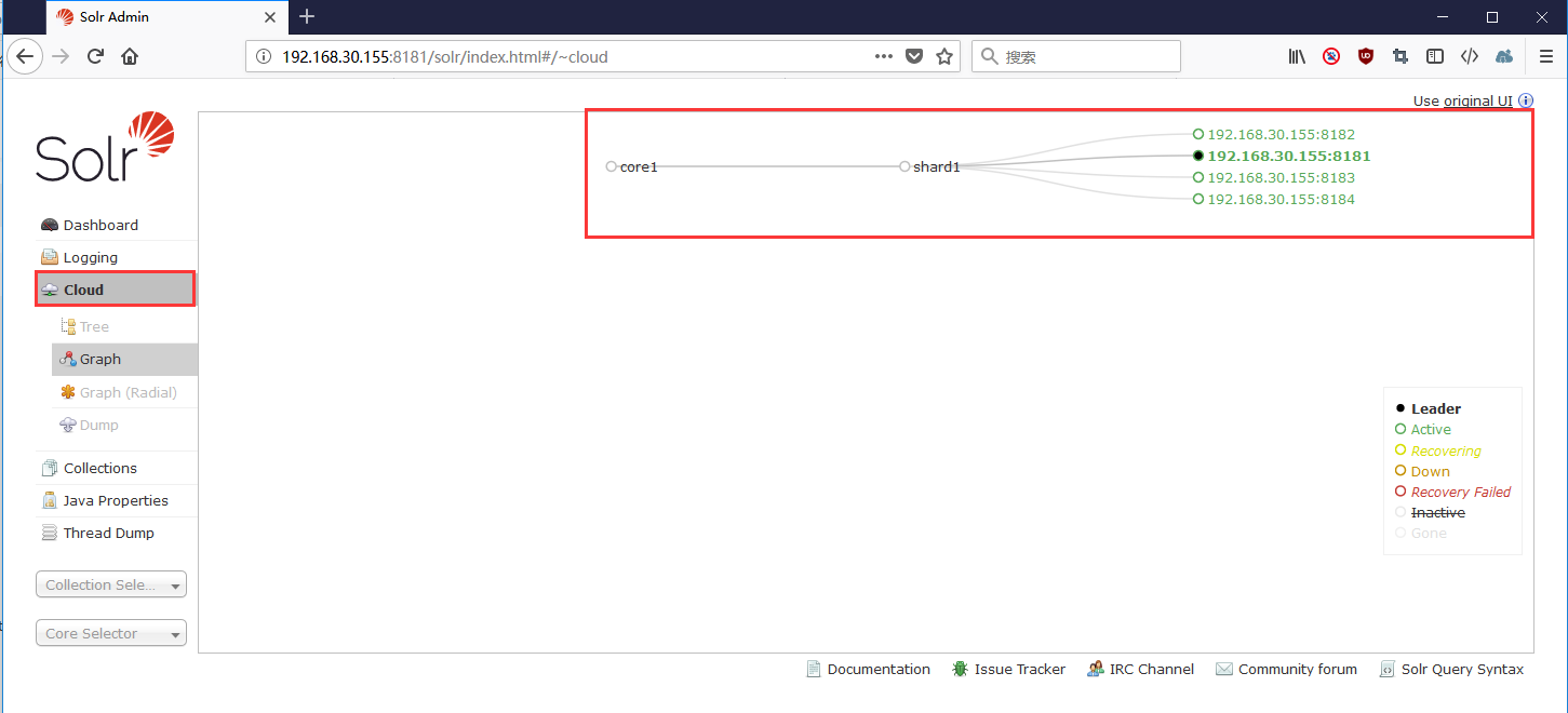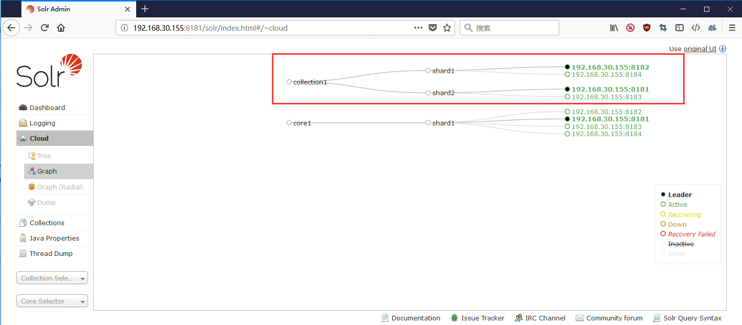 访问任何一个 solr,选择 cloud 标签,可以看见我们的集群已经显示出来了: