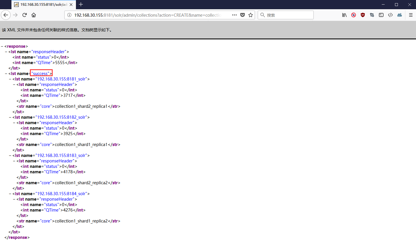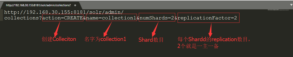 1 | http://192.168.30.155:8181/solr/admin/collections?action=CREATE&name=collection1&numShards=2&replicationFactor=2 |