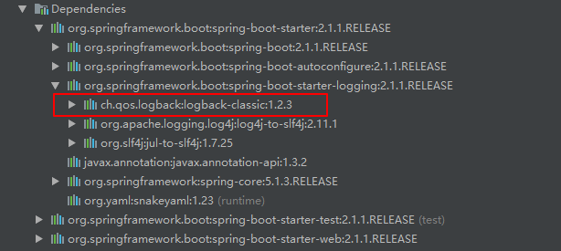 默认情况下,SpringBoot 采用 Logback 来记录日志,并输出 INFO 级别日志到控制台。从下图可以看到,spring-boot-stater 的依赖中已经包含了 Logback,因此我们无需手动导入依赖。