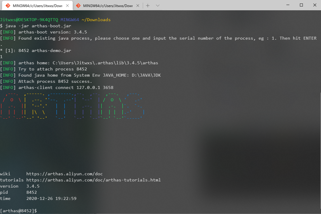 Arthas 本身也是个 Java 进程,得益于 Java 跨平台特性,所以我就直接在 Windows 上安装了。