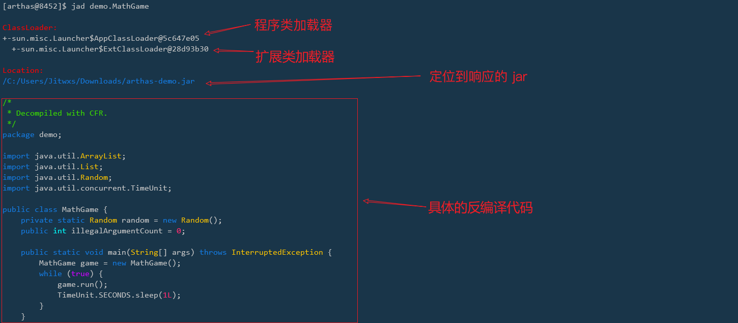 如果只是退出当前的连接,可以用quit或者exit命令。Attach到目标进程上的 Arthas 还会继续运行,端口会保持开放,下次连接时可以直接连接上。