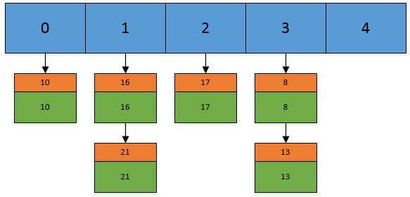 假设我们现在 Hashtable 的容量为 5,已经存在了 (5,5),(13,13),(16,16),(17,17),(21,21) 这 5 个键值对,目前他们在 Hashtable 中的位置如下: