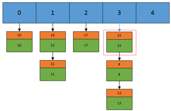 然后我们现在再插入一个,put(33,33),key=33 的索引为 3,并且在链表中也不存在 key=33 的 Entry,所以将该节点插入链表的第一个位置。