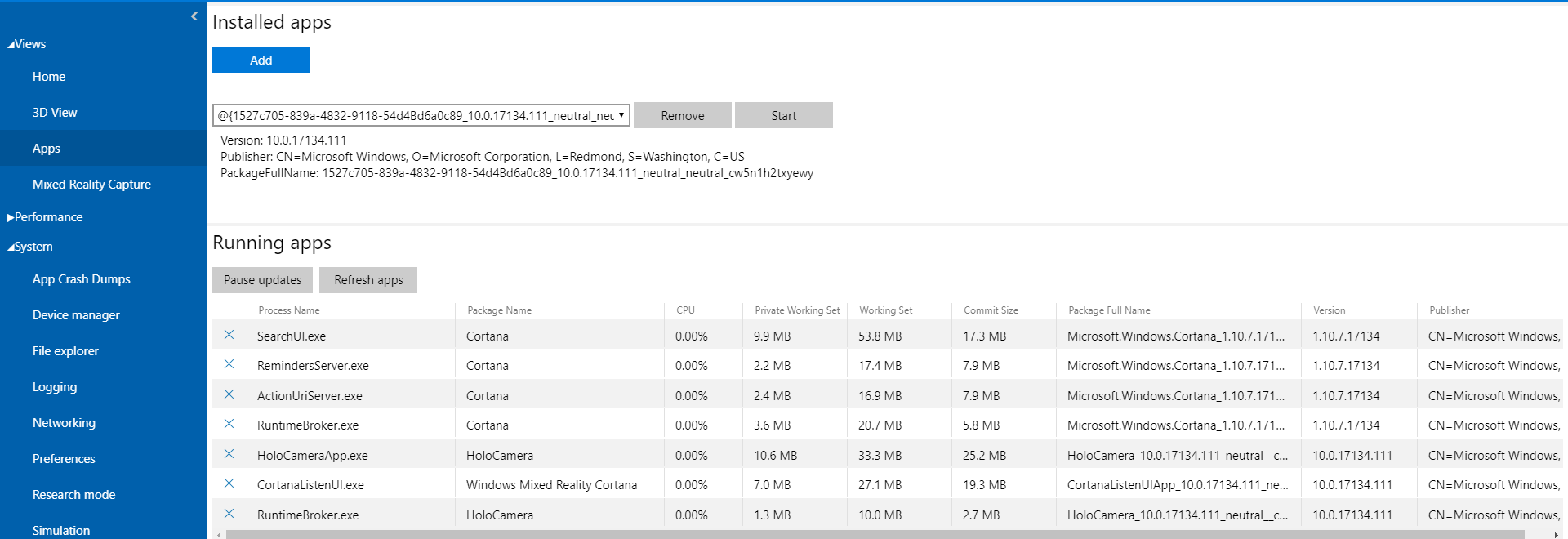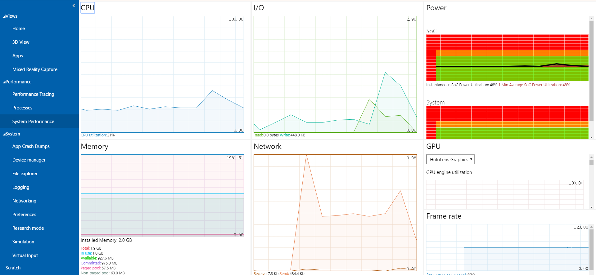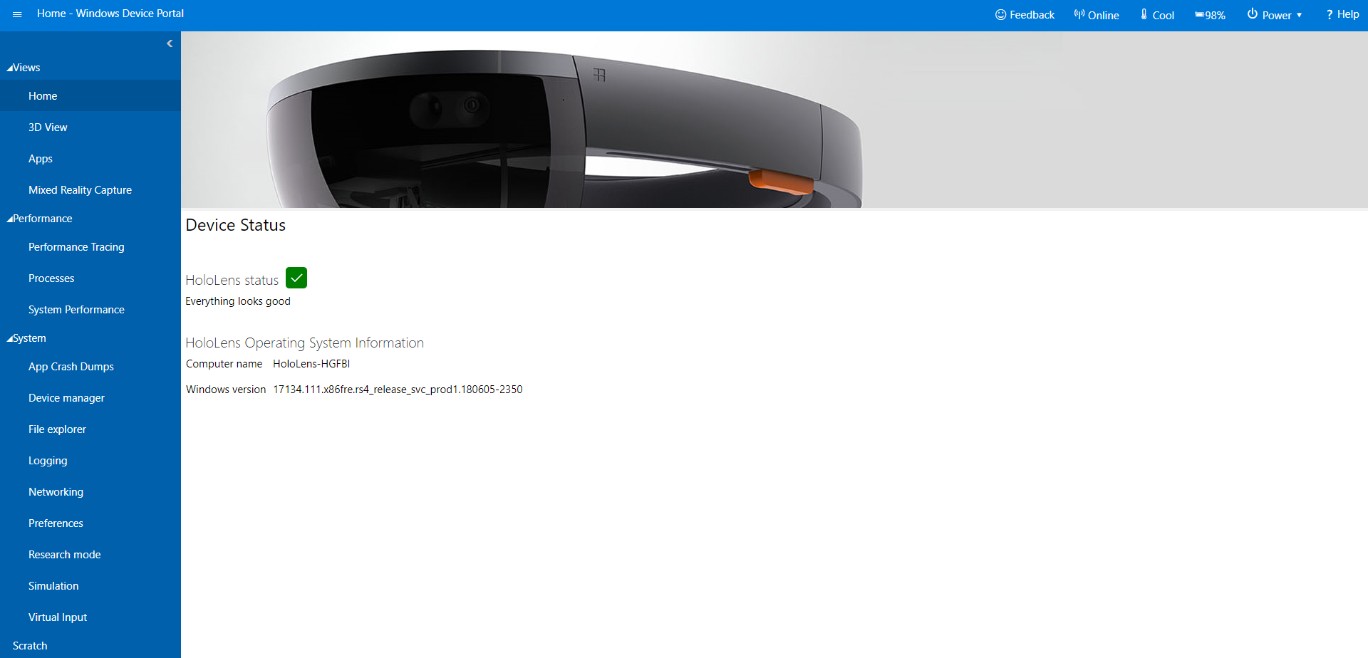 Windows设备控制台允许你通过 Wi-Fi 或 USB 来远程控制你的 HoloLens 设备。设备控制台是 HoloLens 上的一个 Web Server,你可以通过PC的浏览器来连接到它。设备控制台包含了很多帮助你管理、调试和优化 HoloLens 设备的工具。