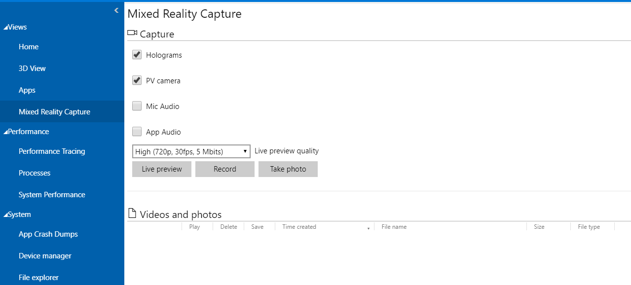 注意:当你从设备控制台纪录或实时预览捕获流时,HoloLens 应用将不能捕获 MRC 视频或者照片