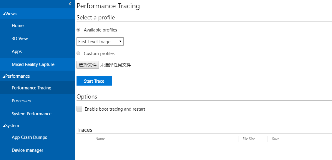 • Custom profile:点击 Browse 从 PC 选择一个 WPR 配置文件。点击 Upload and start 开始性能捕捉