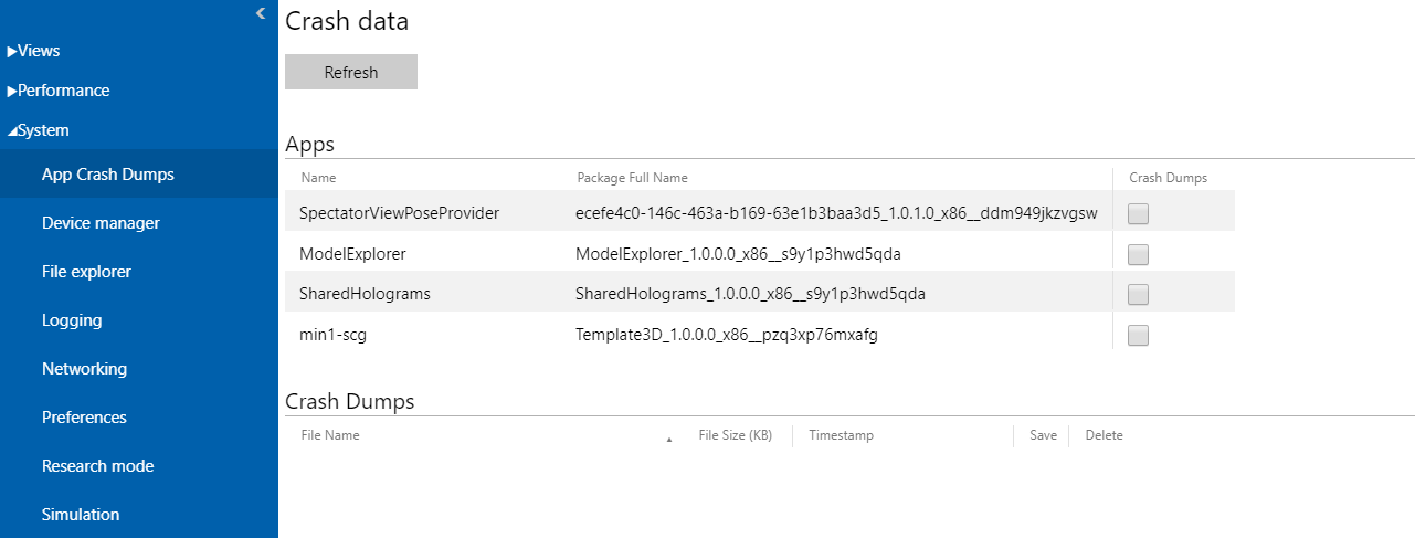 这个页面允许你收集旁加载应用的崩溃日志。为每一个你想收集崩溃日志的应用选中 Crash Dump,然后返回此页面收集崩溃日志。dump 文件可以使用 Visual Studio 打开来 调试