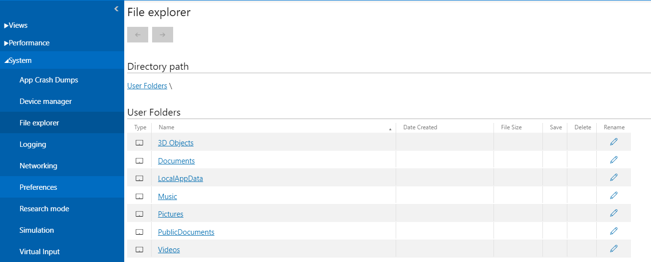 使用文件资源管理器浏览、上传和下载文件。您可以在 Documents 文件夹、Pictures 文件夹和本地存储文件夹中处理从 Visual Studio 或设备门户部署的应用程序的文件。