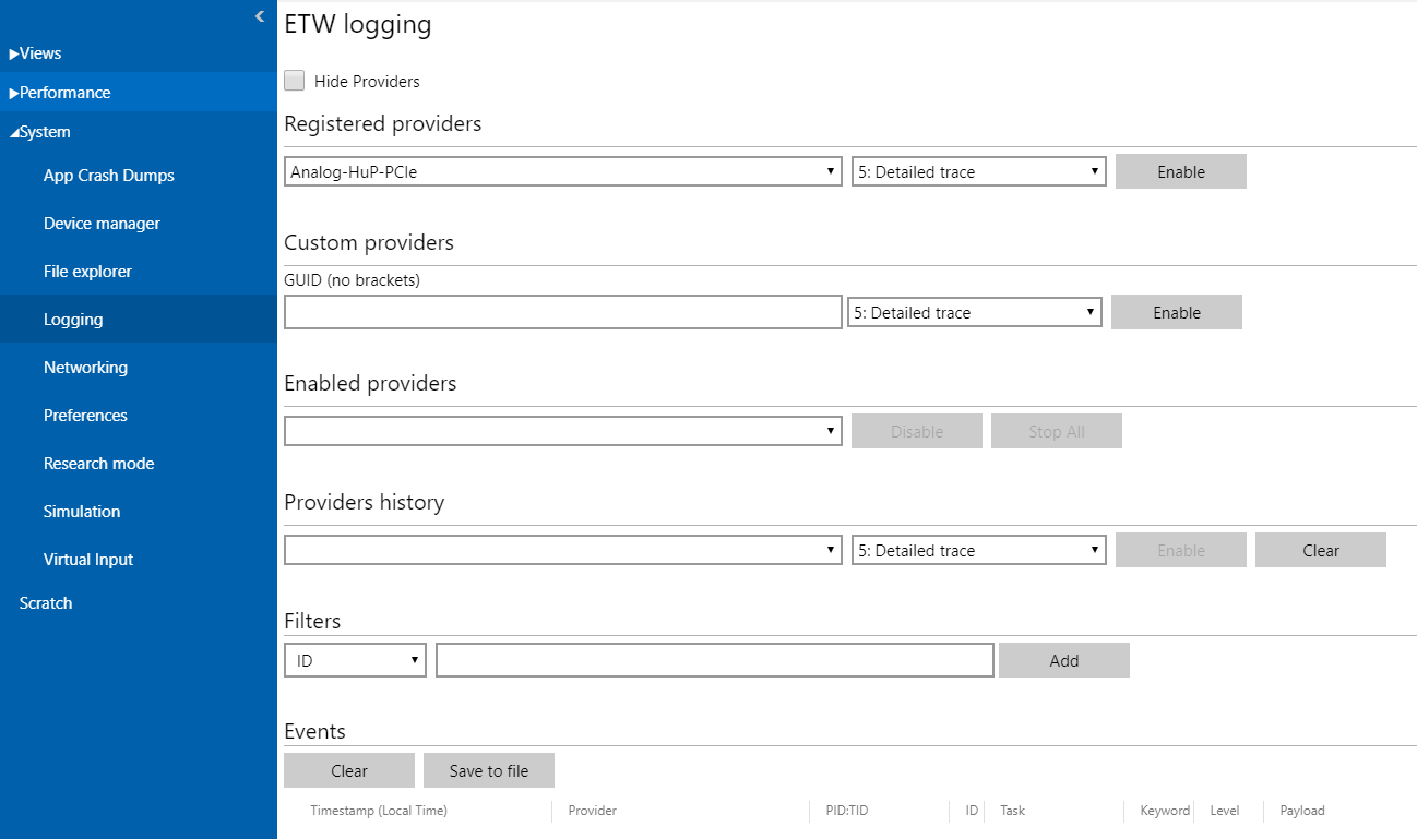 • Custom Providers:选择一个自定义 ETW 来源喝追踪级别。通过 GUID 来标志提供者。GUID 不要包含括号
