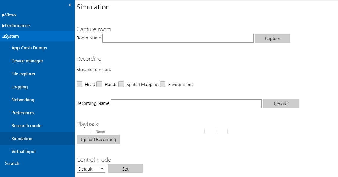 • Control mode:从下拉框选择 Default或者Simulation,点击 Set 按钮在 HoloLens 上启用此模式。选中“Simulation”,将会禁用 HoloLens 上真实的传感器,而使用上传的模拟数据。如果启用 Simulation 模式,HoloLens 将不会响应真实用户直到切换回Default模式。