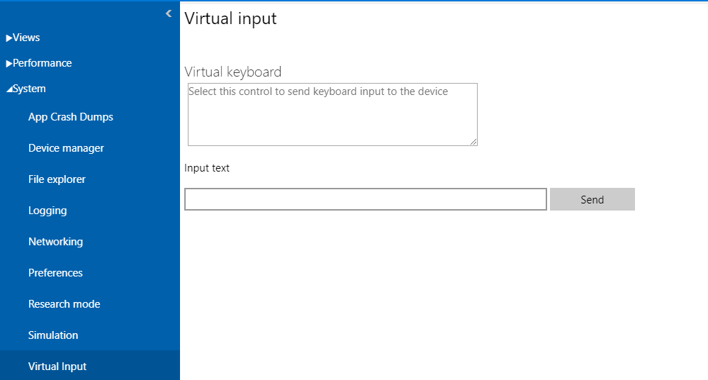 点击 Virtual Keyboard 下方区域来放松键盘点击数据到 HoloLens 。在Input text中输入内容,然后点击Send按钮来发送内容到当前应用。