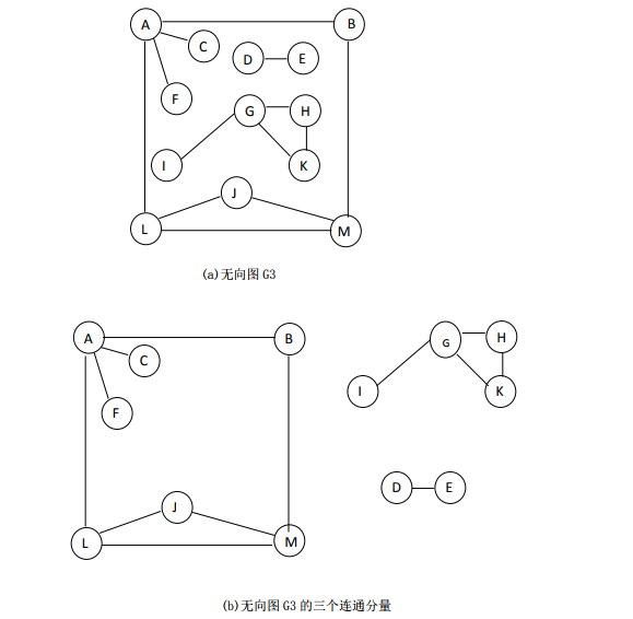 在无向图 G=(V,E)G=(V,{E})中,若从 viv_ivjv_j 有路径相通,则称顶点 viv_ivjv_j 是连通的。如果对于图中的任意两个顶点vivjVv_i、v_j∈Vviv_ivjv_j都是连通的,则称该无向图 G 为连通图无向图中的极大连通子图称为该无向图的连通分量,这里所谓的极大是指子图中包含的顶点个数极大。
