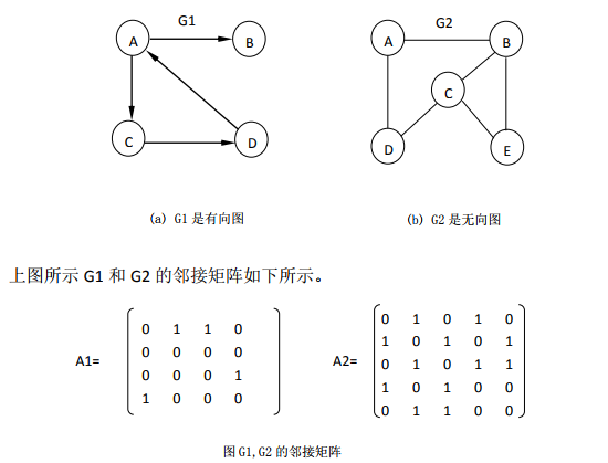 在邻接矩阵表示中,**除了存放顶点本身信息外,还用一个矩阵表示各个顶点之间的关系。**若(i,j)∈E(G) 或 < i,j >∈E(G),则矩阵中第i行第j列元素值为1,否则为0 。