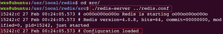 1 | wxs@ubuntu:/usr/local/redis/src$ ./redis-server ../redis.conf |