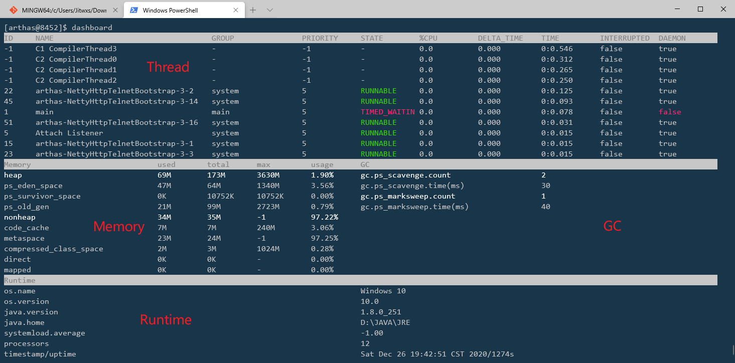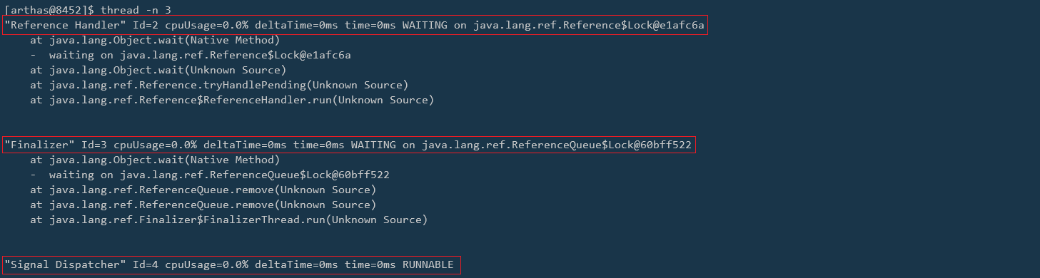 [Internal]表示这是 JVM 内部线程,和 dashboard 命令中相同。 -