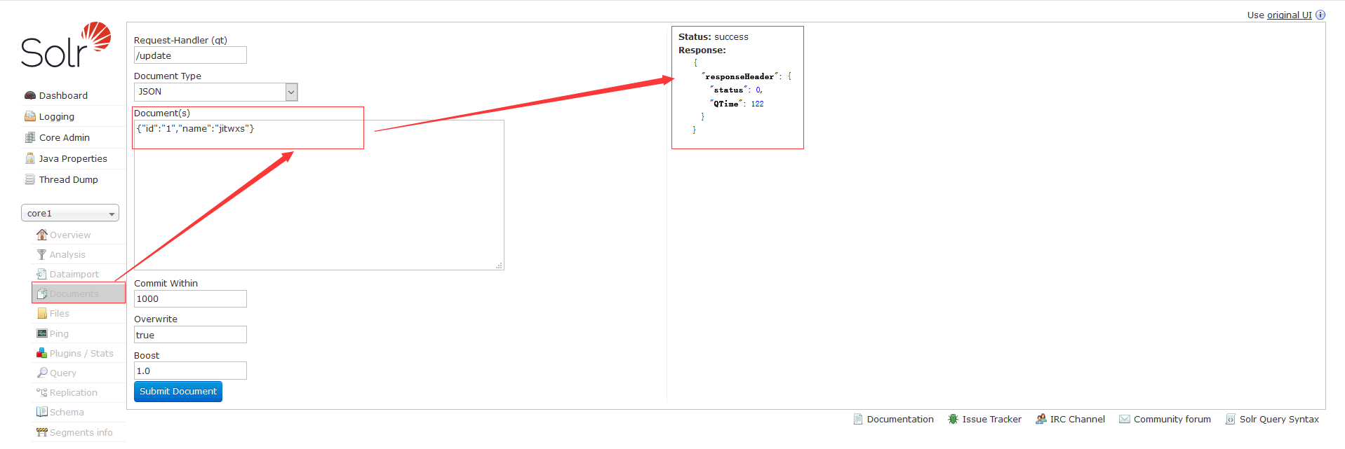 我们在后台系统中选择 core1,点击 Documents,在里面添加一个 Document(文档),内容如下: