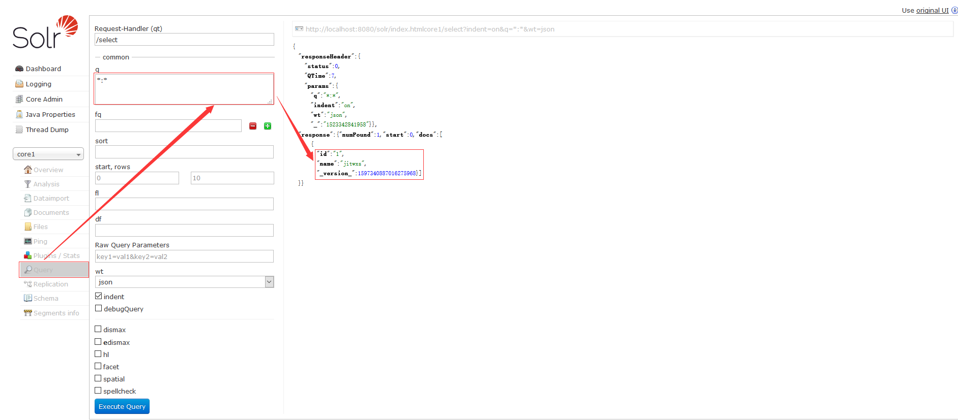 然后选择 Query,查询条件设为 *.*,即查询所有,就可以看见我们刚刚插入的 Doucment: