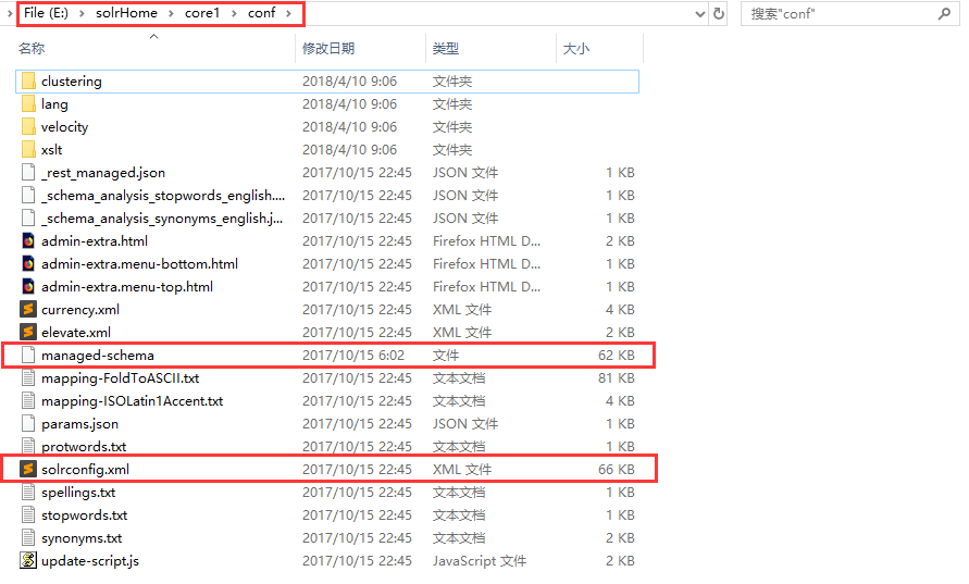 我们打开 core1 的 conf 文件夹,其中有两个重要的配置文件需要我们掌握,一个是 managed-schema,一个是 solrconfig.xml,其中是 managed-schema 就是 Solr 对域的配置文件。