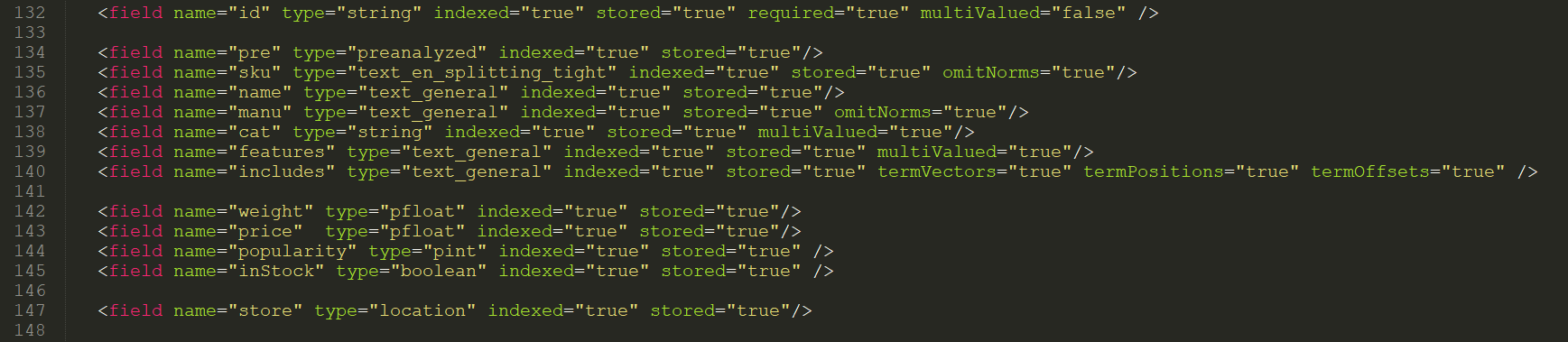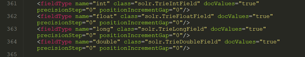 打开 managed-schema 文件,首先介绍下 field 标签,这里是 Solr 帮我们预设好的域,如图示: