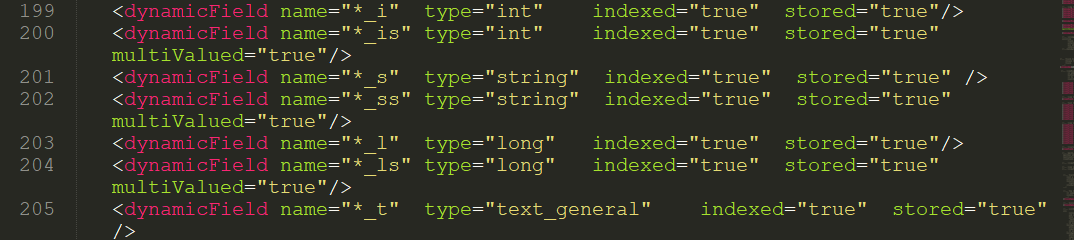 但是每次修改配置文件都需要重启 Solr 服务,有没有更方便的方法呢?其实有的,Solr贴心的帮我们想好了自定义 Filed 问题,其中有一个dynamicField标签,列举其中一部分如下: