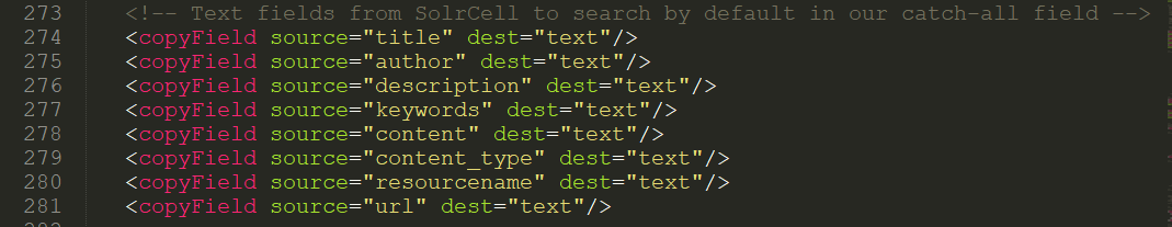 如图所示,配置文件中定义了一堆 copyField,其中就有 author 和 description,我们发现这两个域的 dest 属性均为 text。