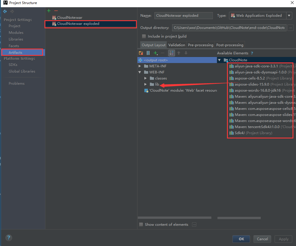 选择File–>Project Structure–>Aritfacts–>项目的exploded,首先查看output root中是否有lib文件夹,没有则新建,然后双击最右侧的所有jar包,它们会自动被添加到lib文件夹中。