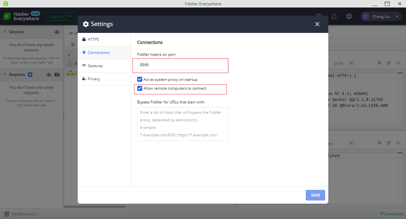 Connections选项卡,可以指定监听端口,直接使用默认的8866即可。 - 勾选下方