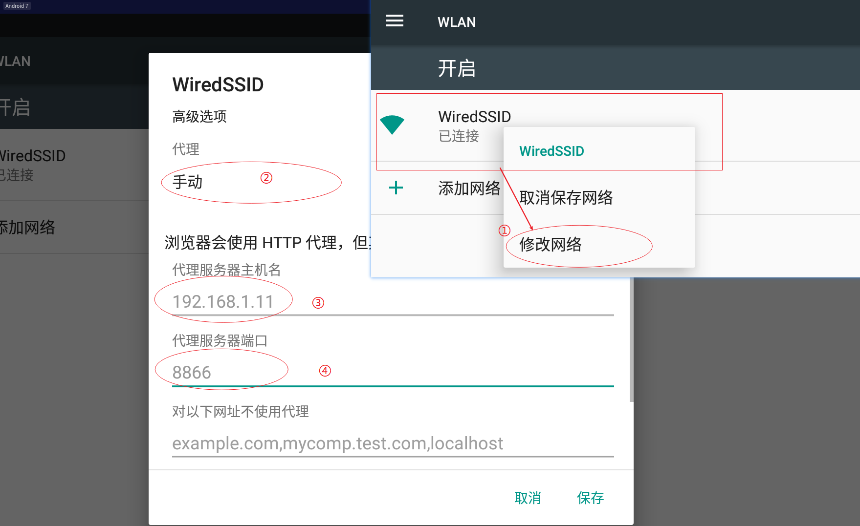 高级选项,将代理设置为手动,在下方填入代理服务器的IP和端口号。- IP 为运行模拟器的宿主机 IP(使用