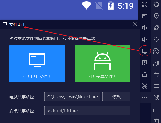 - 基本所有模拟器都支持宿主机与模拟器之间的文件拷贝,我们需要将前文中导出到桌面的