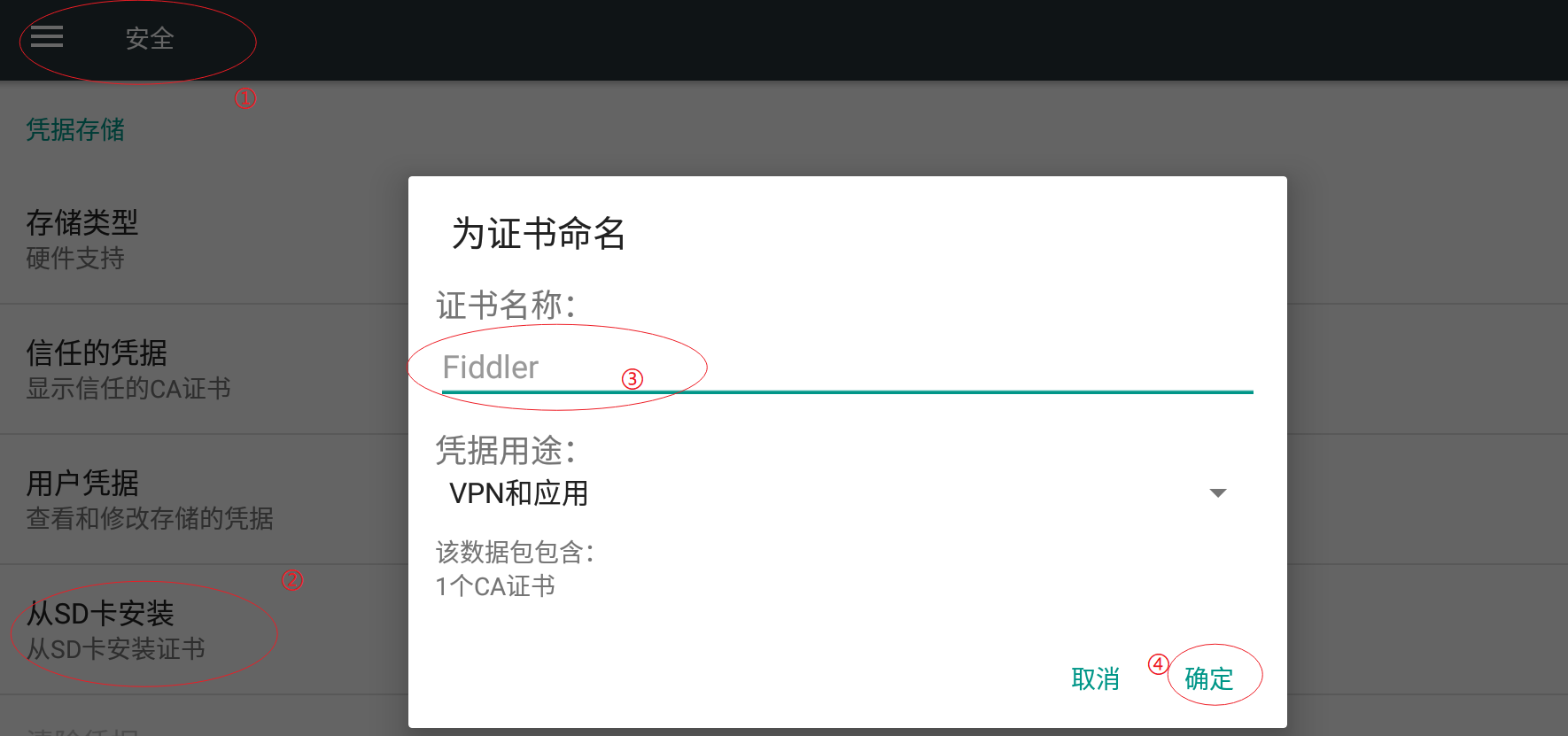 设置 -> 安全 -> 从 SD 卡安装,选择上一步中拷入的文件,设置好名字后,点击确认即可。(会提示你给模拟器设置一个密码,正常设置即可)
