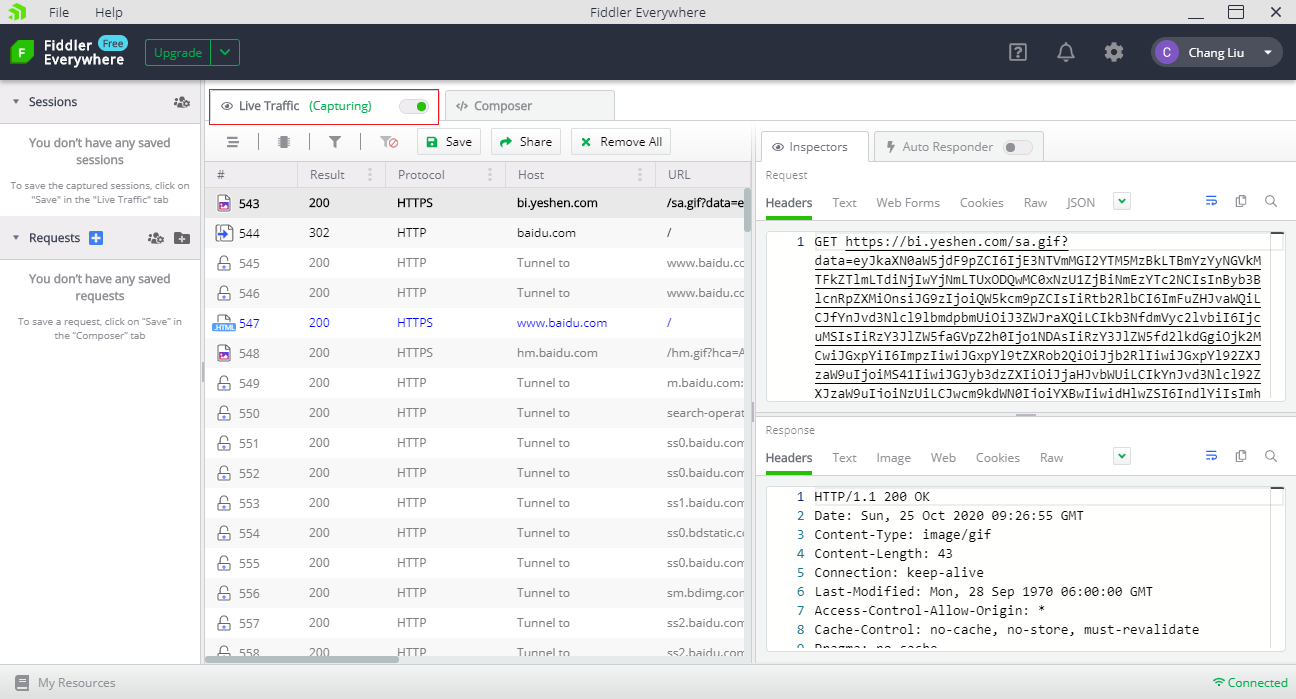 当完成抓包后,记得将 Live Traffic 选项卡右侧的滑动按钮关闭,否则可能会影响你正常访问浏览器。